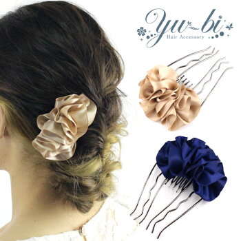 【メール便140円】特許取得!夜会巻きコーム しっかり/ヘアコーム/コーム/モアコームボーテ ふんわりサテン mcbe28 紺/ベージュ/ローズ(ピンク) 髪飾り ヘアアクセサリー デイリー まとめ髪 着物 結婚式 アレンジ髪【あす楽対象】【リボン】
