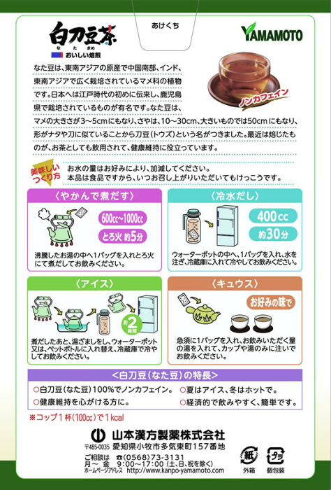 【仕様】●内容量:6g×12包●原材料:白刀豆生産国:日本商品区分:健康食品メーカー:山本漢方製薬株式会社広告文責:フォーレスト株式会社 0120-40-4016【検索用キーワード】山本漢方製薬株式会社 やまもとかんぽう ヤマモトカンポウ YAMAKAN ヤマカン 白刀豆茶100% なた豆茶100% 6g 12包 12本 12パック ティーバッグ 1箱 なた豆 刀豆 なたまめ ナタマメ なた豆茶 刀豆茶 健康食品 健康茶白刀豆(なた豆)を、まるごと100%焙煎