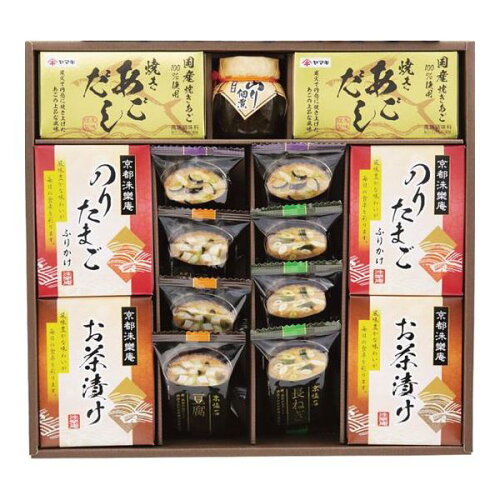 商品内容:●京懐石フリーズドライ(豆腐×3、長ねぎ×3、茄子×2)、京都洙樂庵 のりたまごふりかけ(4g×4P)×2、ヤマキ焼きあごだし(4g×10)×2、京都洙樂庵お茶漬けの素(宇治抹茶・だししょう油×2)×2、島乃香のり佃煮80g×1●【賞味期間】製造日より(約)常温540日間●アレルギー【卵・乳・小麦】●箱サイズ(約)6.5×34.8×37.1cm●箱重量(約)829g●梱包状態:化粧箱入 ※のし包装(ラッピング)はひとつずつ無料で致します。