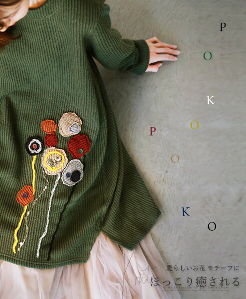 TOP > ニット。チュニック。リブ。花モチーフ。グリーン。愛らしいお花 モチーフに ほっこり癒される10/28×メール便不可[2、3]