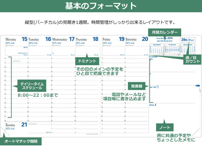 この手帳のレイアウト内容【手帳週間縦軸】海外の雰囲気が漂うゴシック書体。